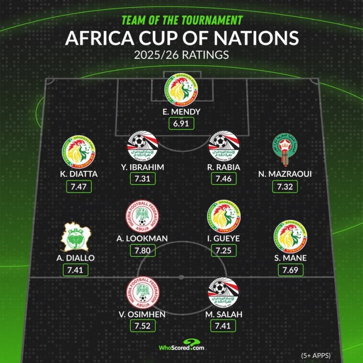 whoscored非洲杯最佳阵:马内领衔塞内加尔4将 萨拉赫奥斯梅恩在列