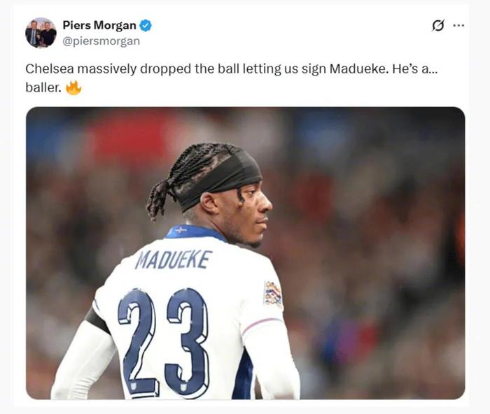 赛后,英国知名记者、阿森纳球迷皮尔斯-摩根更新社交媒体发文赞美马杜埃凯:切尔西真是大意了,让我们签下了马杜埃凯。他真是个超级球员!