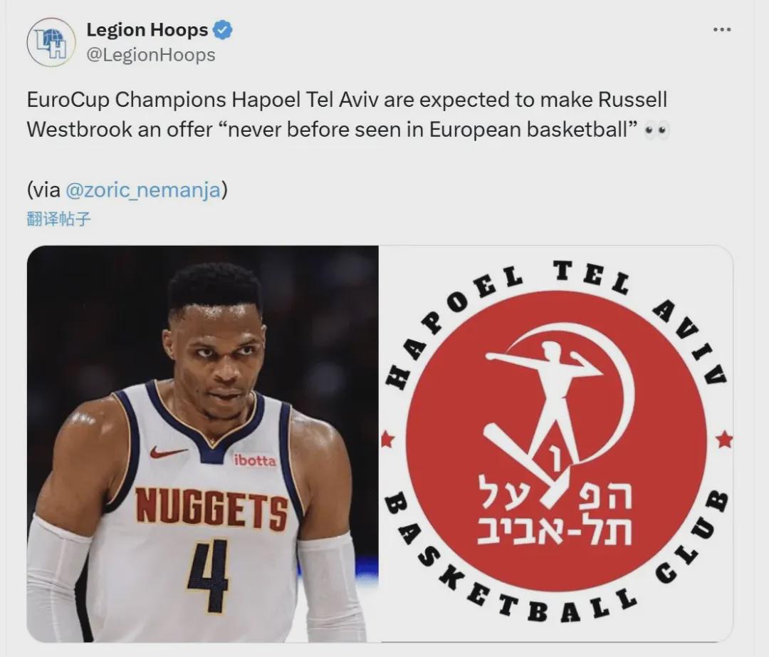 或许会有老哥说威少想离开NBA了,因为此前有报道欧洲杯冠军以色列特拉维夫哈普尔俱乐部准备以天价合同拿下他,其就经不住诱惑打算开启海外联赛之旅。