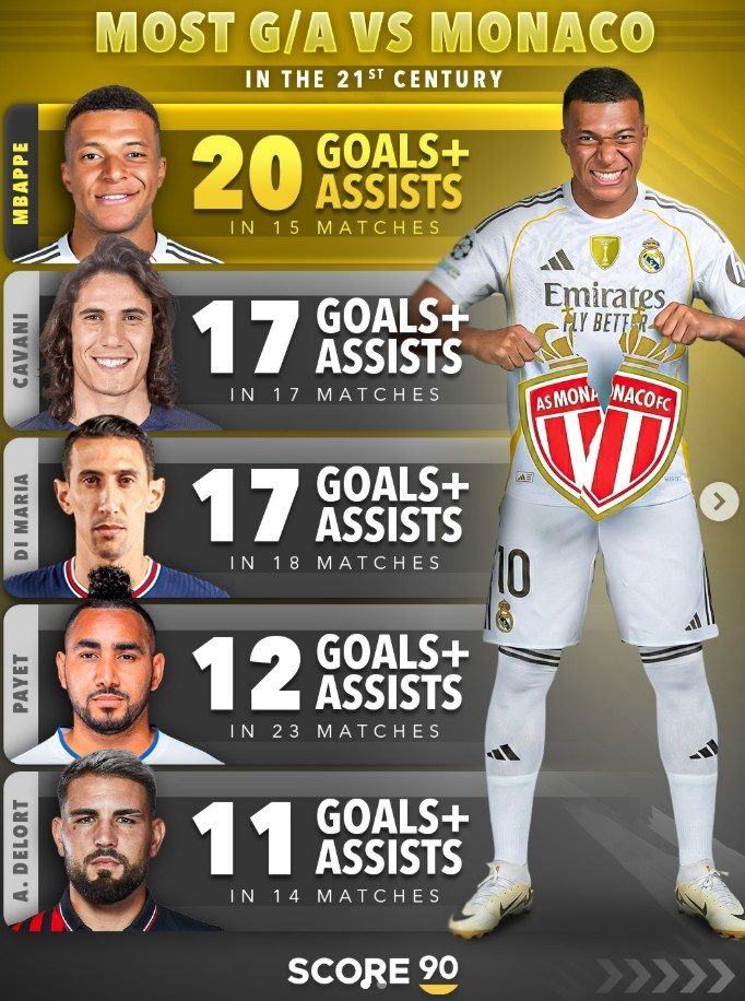 据统计,姆巴佩在面对老东家摩纳哥的15场比赛中已经直接参与20球,在21世纪对阵摩纳哥参与进球(进球+助攻)榜上位居第一,具体榜单如下: